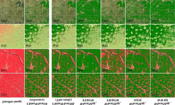 图 6. 在不同类型区域中对比ChinaWheat10(参考数据)、ChinaWheat30L、WheatMap_PTDTW、WheatMap_TWDTW、WheatMap_OZM和WheatMap_WWMI(对应第2至第7列)冬小麦图的表现。对比区域包括:(a) 小农田,(b) 国有农场,(c) 冬小麦与果树交错带,(d) 冬小麦与油菜混作区。其中(a)与(b)使用的是合成的假彩色Landsat卫星图像作为背景图像,而(c)与(d)由于缺乏高质量Landsat图像,分别使用了假彩色(NIR-SWIR-红光)Sentinel-2图像和真彩色(红-绿-蓝)PlanetScope图像作为背景。(有关图中颜色的说明,请参阅本文网络版。)