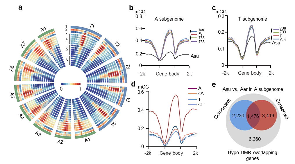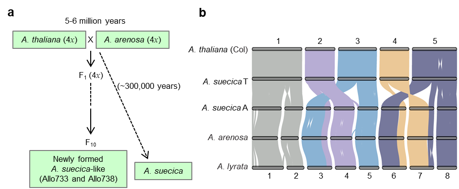 多倍体化(全基因组加倍)在自然界中广泛分布,是许多植物和部分动物进化和多样性形成的重要驱动力。异源多倍体不但加倍基因组,同时也固定了种间的杂交优势,通常表现出更强的生长势,更好的环境适应能力。但异源多倍体必须克服种间杂交引起的“基因组冲击”(Genomic Shock);有些多倍体植物如油菜表现出亚基因组之间的交换,而另一些多倍体植物如棉花和拟南芥的亚基因组却比较稳定,并在进化中逐渐建立起自身适应性和选择优势,但这种多倍体植物的不同进化机制仍不清楚。拟南芥属一直是植物研究的重要实验材料,其中天然的异源四倍体拟南芥A. suecica (TTAA)是由拟南芥属的不同种A. thaliana(TT)和A. arenosa(AAAA)杂交而成,是研究多倍体的优良模式植物(图1a)。遗憾的是,A. suecica及其A基因组供体祖先A. arenosa至今并没有高质量的参考基因组,限制了更深入的研究。近日,成人视频 多倍体研究团队在Nature Ecology & Evolution上发表了题为“Concerted genomic and epigenomic changes accompany stabilization of Arabidopsis allopolyploids”的研究论文,绘制了天然的异源四倍体拟南芥A. suecica和人工合成的异源四倍体拟南芥Allo738的高质量基因组,并解析了异源多倍体植物进化过程中的遗传和表观遗传调控机制。