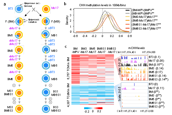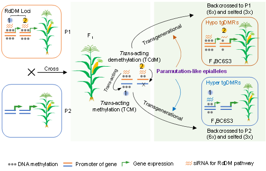 表观遗传变异不受DNA序列控制,但由DNA甲基化、组蛋白修饰和小RNA等调控,被称之为“软遗传”,对动、植物应对内、外因素(包括杂交、基因组互作、外界环境刺激等)具有很高的可塑性。上世纪50年代在玉米和高粱中报道的副突变现象就是一个经典的杂交诱导DNA甲基化变异跨代遗传的实例。副突变现象在动物小鼠中也有报道,但对于其发生的机制并未进行系统性的全基因组水平上的研究。