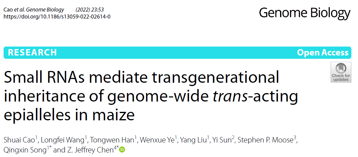 《Genome Biology》发表多倍体团队“Small RNAs mediate transgenerational inheritance of genome-wide trans-acting epialleles in maize”