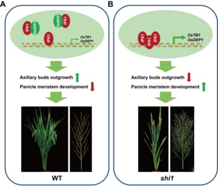 万建民院士课题组研究人员鉴定了一个新的水稻株型发育突变体shi1(shortinternode1),其分蘖数减少、茎秆粗壮并且穗分枝数显著增加。图位克隆结果表明,目的基因OsSHI1编码植物特异转录因子,主要在腋芽及幼穗中表达。研究人员通过酵母双杂交筛库鉴定出了一个重要的互作蛋白,IPA1(即理想株型调控因子OsSPL14)。IPA1对水稻株型发育的调控主要是通过调控下游关键基因OsTB1及OsDEP1来实现。有趣的是,在这两个基因的启动子中均发现OsSHI1识别基序的存在,并且OsSHI1可直接结合OsTB1及OsDEP1的启动子。在突变体shi1中,OsTB1及OsDEP1的表达水平显著上调。进一步研究发现,OsSHI1可降低IPA1对OsTB1及OsDEP1启动子的结合能力并抑制其对下游靶基因的转录激活活性,进而协同调控水稻株型的发育。