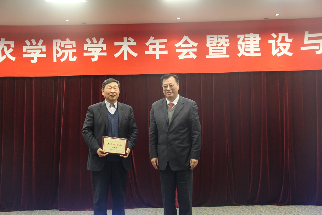 我院1975届校友张洪程院士在水稻高产栽培理论与技术研究及水稻产业发展做出突出贡献获得杰出服务奖,水稻遗传育种创新团队、作物精确栽培创新团队、小麦遗传育种创新团队、棉花遗传育种创新团队、水稻栽培生理创新团队、大豆遗传育种创新团队等6个科研团队获得突出贡献奖,姜东、郭旺珍、吴玉峰、关雪莹、刘裕强5位教授获得杰出人才奖,王州飞、杨海水、刘小军3位青年教师因在教学、科研、推广方面做出突出成绩而获得优秀新人奖。曹卫星、翟虎渠、丁艳锋、陈佩度分别为获奖人员及团队颁奖。