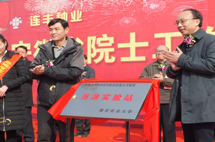 院长朱艳教授、科研院副院长俞建飞、国家大豆改良中心主任赵团结教授及来自安徽省科技厅、农委、马鞍山市、当涂县各级领导,南京大学、安徽农业大学、中国农科院棉花研究所等多家科研院所及当地部分种业企业代表参加了揭牌仪式。盖钧镒院士和马鞍山市副市长方文共同为院士工作站揭牌。