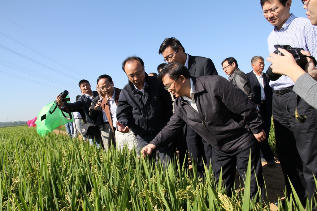 与会领导和专家首先来到东海县和赣榆县的百亩示范方,对水稻长势情况进行了观摩考察。万建民和丁艳锋分别介绍了“宁粳4号”的选育过程、品种特性、设计栽培技术和示范推广情况。