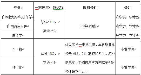 1.第一志愿报考我院作物栽培学与耕作学、作物遗传育种、遗传学3个专业的考生总分在310分以上,英语50分以上(含310分,50分),可以参加所报考专业复试;报考作物和种业2个专业的考生复试分数线总分在280分以上,英语45分以上(含280分,45分),可参加复试,不足部分调剂。