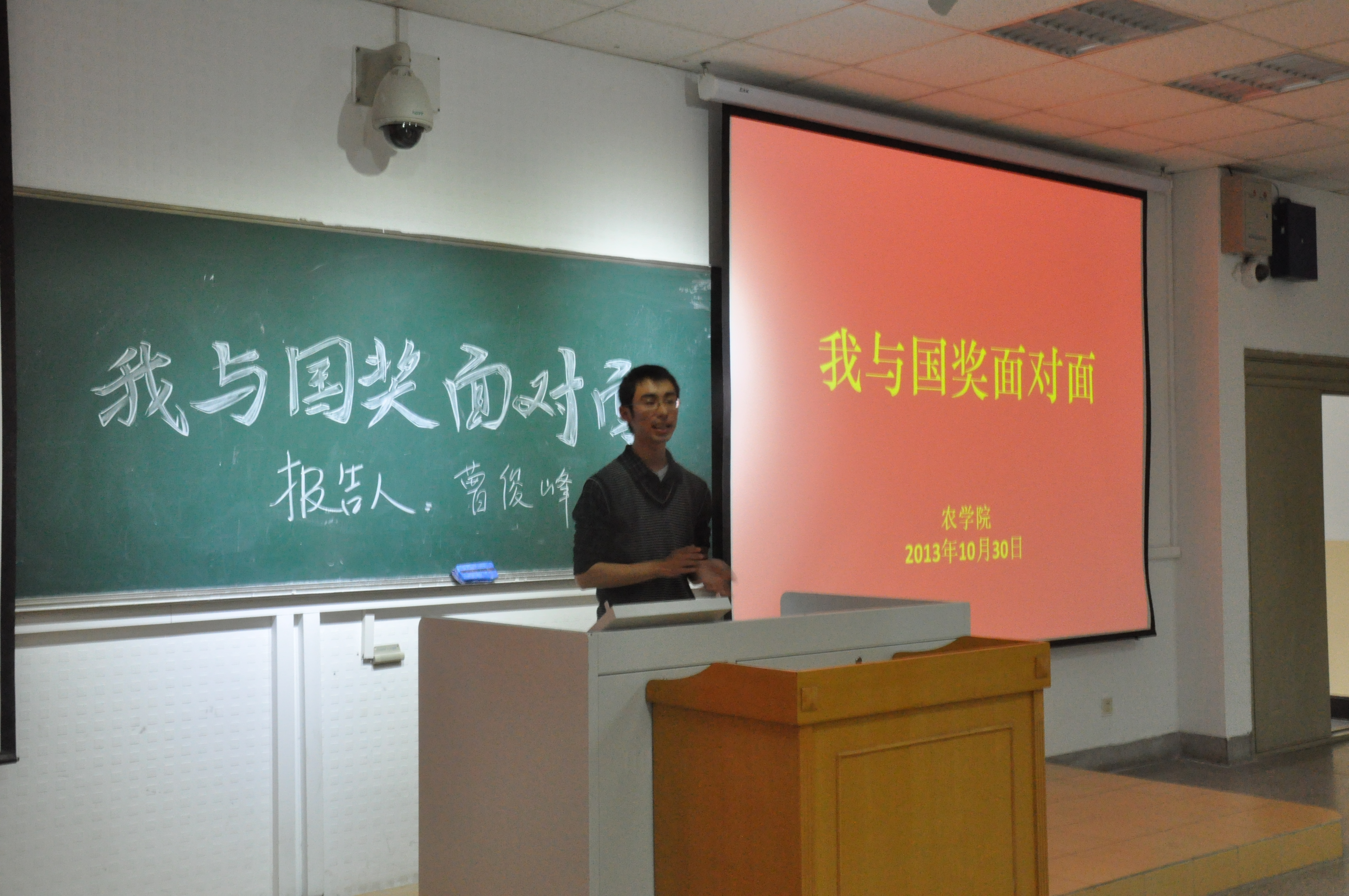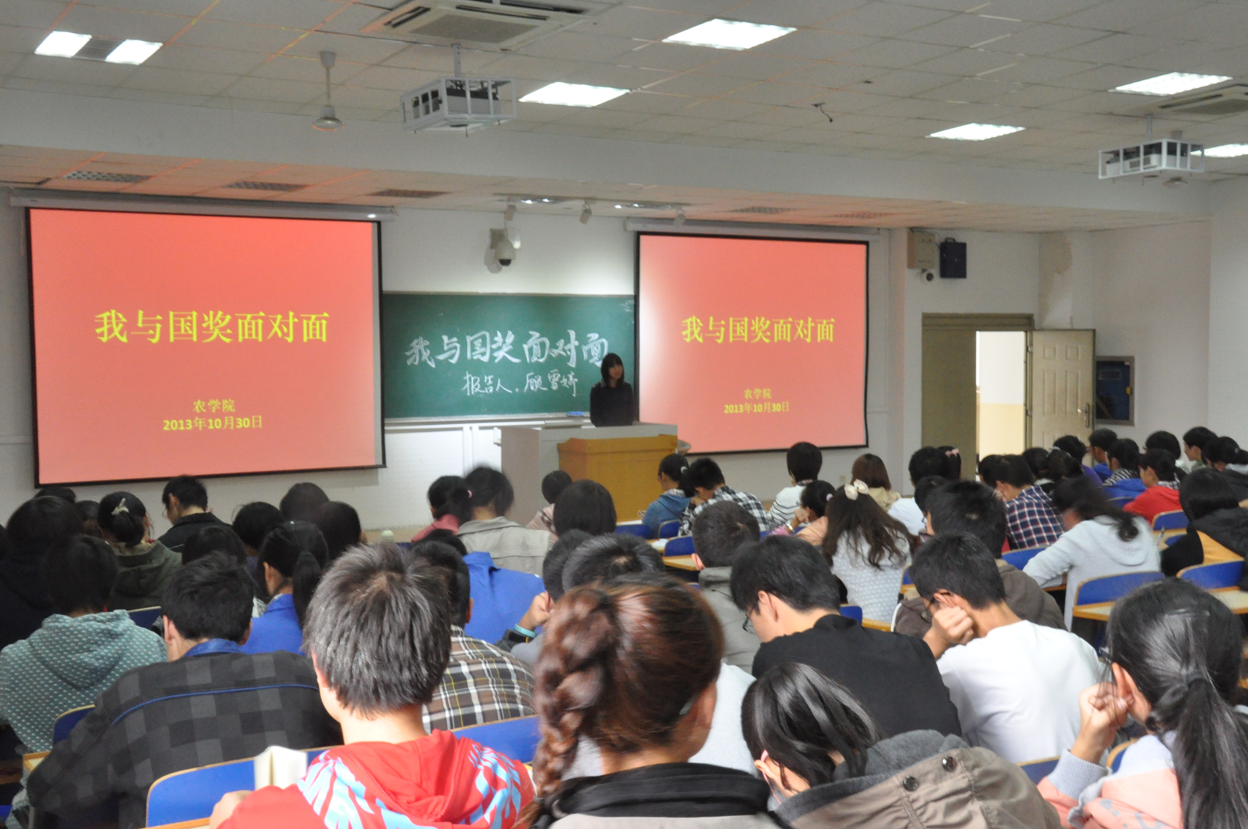 10月30日星期三下午,由成人视频-黄色视频-国产黄色视频 团委学生会主办、学习部承办的主题为“我与国奖面对面”主题报告会于教学楼C301举办,这次报告作为一次别开生面的形势与政策课,令大一的同学们都很期待。学习部邀请了今年获得国家奖学金的五位同学为同学们作关于个人学习经验的报告,分别是植物实验111班曹俊峰、农学113班孙彦、农学114班朱星洁、种子112班李霄和植物实验121班顾雪婷。出席的有成人视频 大一同学及辅导员彭益全。