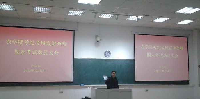 全国大学英语四六级考试及本学期期末考试临近,为确保考试有序进行,强化考试诚信意识,成人视频 于12月13日中午13:00在教学楼C301、C201召开考纪考风宣讲会暨期末考试动员大会。会议分别由辅导员殷美、彭益全主持,2011级和2012级全体学生参加了此次会议。