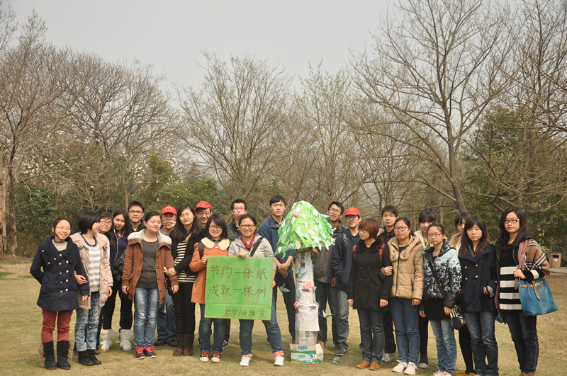 生活部和农学114班在中山陵下马坊联合开展。活动开始前,同学们确立了保护树木的主题,并提出使用废报纸,废铁丝制成一棵“绿树”。在植树节当天10:00整,农学114班全体同学和我院生活部部长黄友访齐聚下马坊。整个活动分为三个部分。首先,将大树以绿色加以点缀,象征绿色的希望,同学们纷纷用刷子将大树粉刷一新。接下来,同学们将折纸叠成了丰富多彩的图案,用丝线悬垂于树上,即为树叶。最后,同学们开始了以“节约纸张,保护大树”为主题的环保宣传活动,获得了很好的反响。