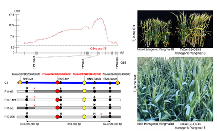 研究人员先利用CItr17600和扬麦18的F2群体,将一个控制每穗小穗节数(SNS)的主效QTL定位在7B染色体上, LOD值达到15.3,解释43%的表型变异。通过重组体表型和基因型鉴定和双亲序列比对,推测TaCOL-B5为候选基因,命名为,编码一种constans类似的蛋白。从CItr17600中克隆了TaCol-B5的cDNA,将其转化到扬麦18中,表型分析发现该基因在转基因的不同时代都可以显著提高每穗小穗节数和籽粒产量,确定了TaCol-B5为控制每穗小穗节数的关键基因。