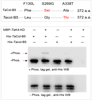 TaCol-B5和Tacol-B5蛋白之间氨基酸的差异影响了与其他蛋白的相互作用。体外磷酸化相互作用的比较研究表明,TaCol-B5和Tacol-B5的Ser269/Gly269取代导致TaK4潜在的差异蛋白磷酸化。研究中还分析了来自全球各地的1756份小麦种质,发现仅有33份二粒小麦携带TaCol-B5等位基因,在全球现代小麦品种中极为罕见。