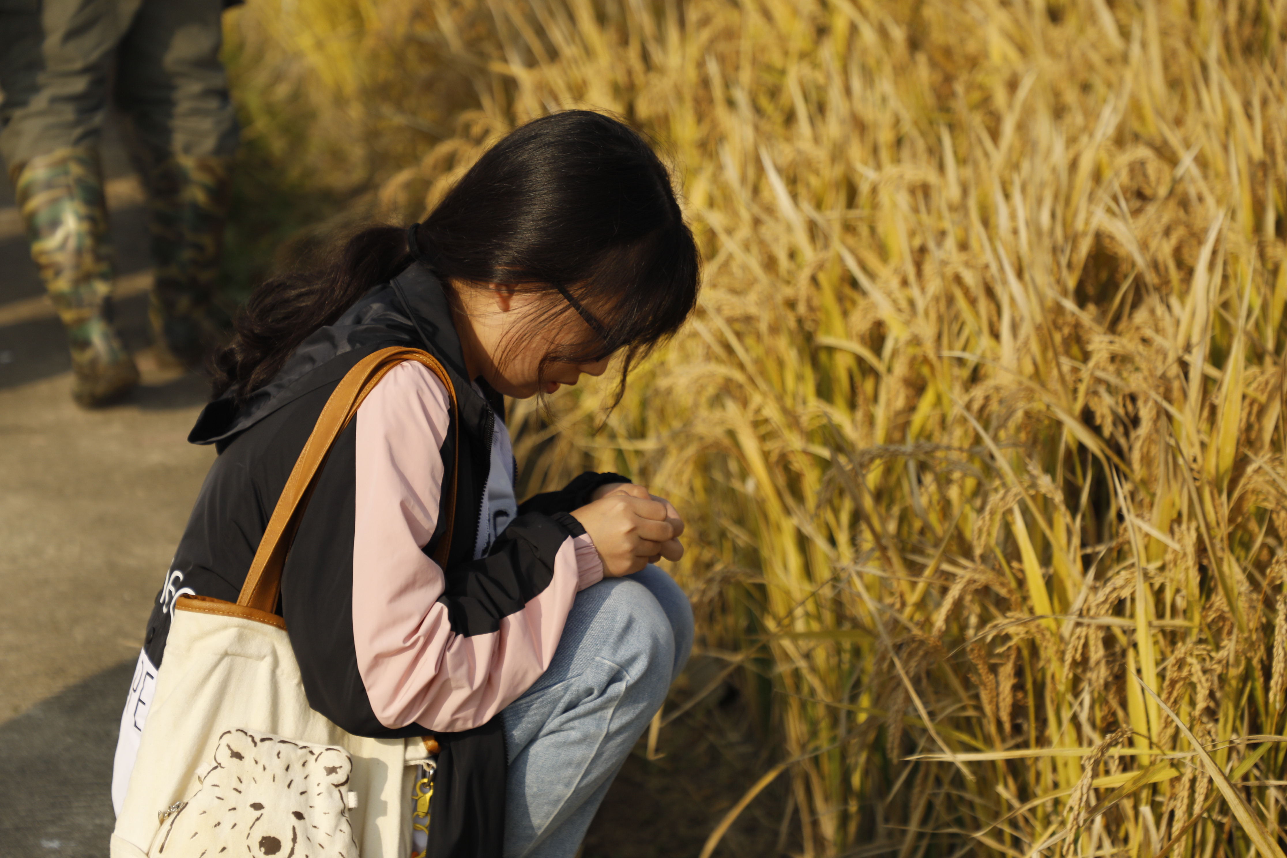 在刘老师的带领和讲解下,同学们有序地在基地中穿梭,认识了许多具有不同功能的实验圃,如植株性状各异、一眼望去高高矮矮的亲本圃,如四面都被网起来的抗虫鉴定圃,又如神秘隐匿在围墙和网盖中的转基因鉴定圃。同学们一边走一边好奇地弯腰靠近稻田,仔细观察不同水稻模样,不时地向老师提出疑问:“老师,品种选育的流程是什么?”,“我们选育出来的优良品种下一步要送往哪里?淘汰的品种又怎么处理?”,“收割之后的稻茬上长出来的苗是什么呀?”……针对这些疑问,老师都一一作了详细解答。不知不觉中,一个成熟的水稻试验基地轮廓及水稻育种工作的大体样貌,在师生们步履不停的讲学中显现出来。