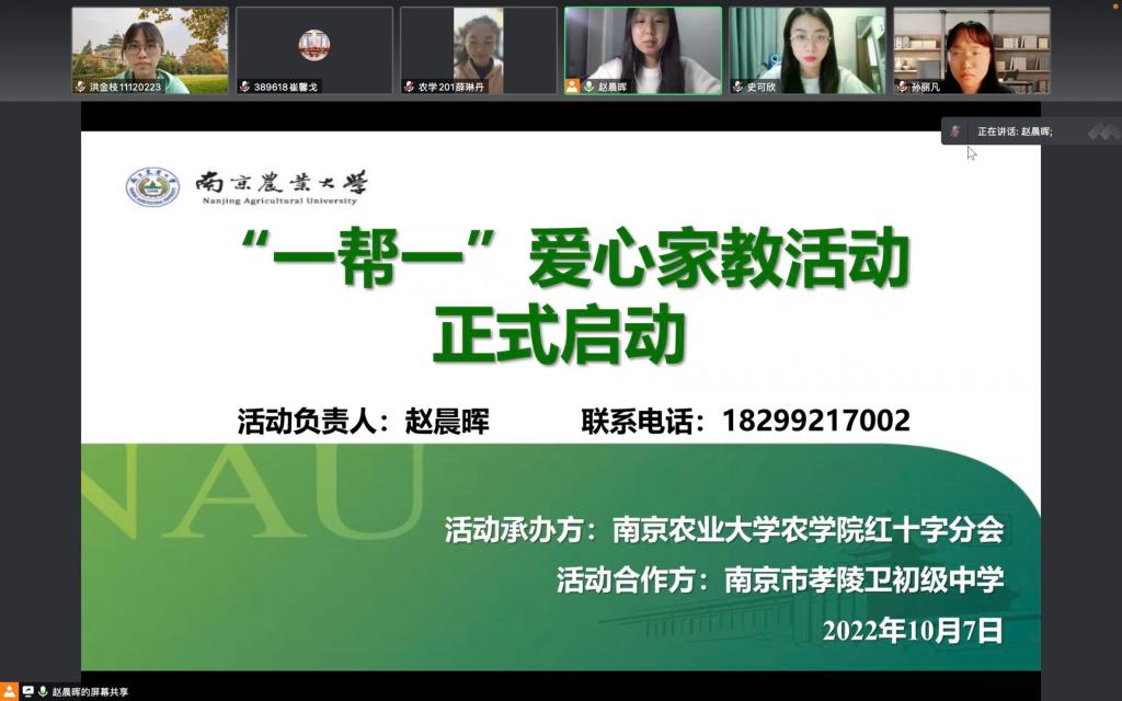 2022年10月7日晚,成人视频-黄色视频-国产黄色视频 “一帮一”爱心家教启动仪式通过腾讯会议举行。参与此次启动仪式的有孝陵卫初级中学团委副书记孙丽凡、成人视频-黄色视频-国产黄色视频 辅导员史可欣、活动志愿者、孝陵卫初级中学学生以及学生家长。本次启动仪式由成人视频 红十字分会部长赵晨晖同学主持。