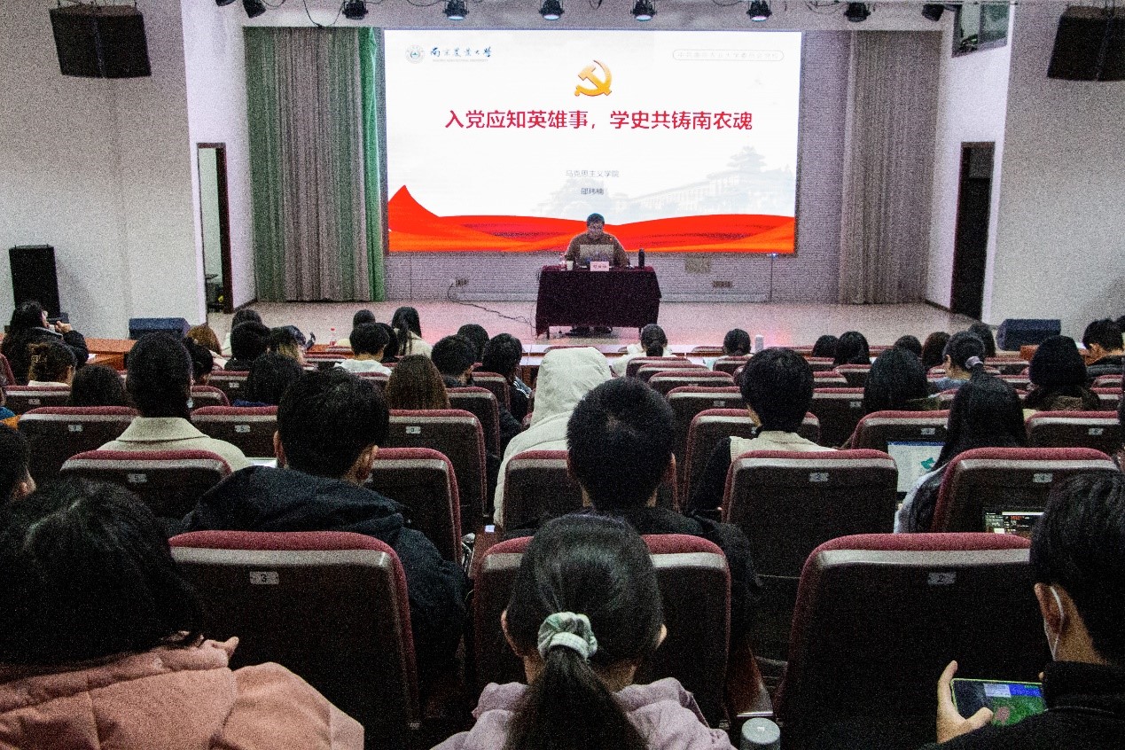12月15日下午,成人视频 在教四楼报告厅举办专题教育党课。马克思主义学院教师邵玮楠作题为“入党应知英雄事,学史共铸南农魂”的专题报告。成人视频 辅导员、分党校学员代表参加了此次党课。