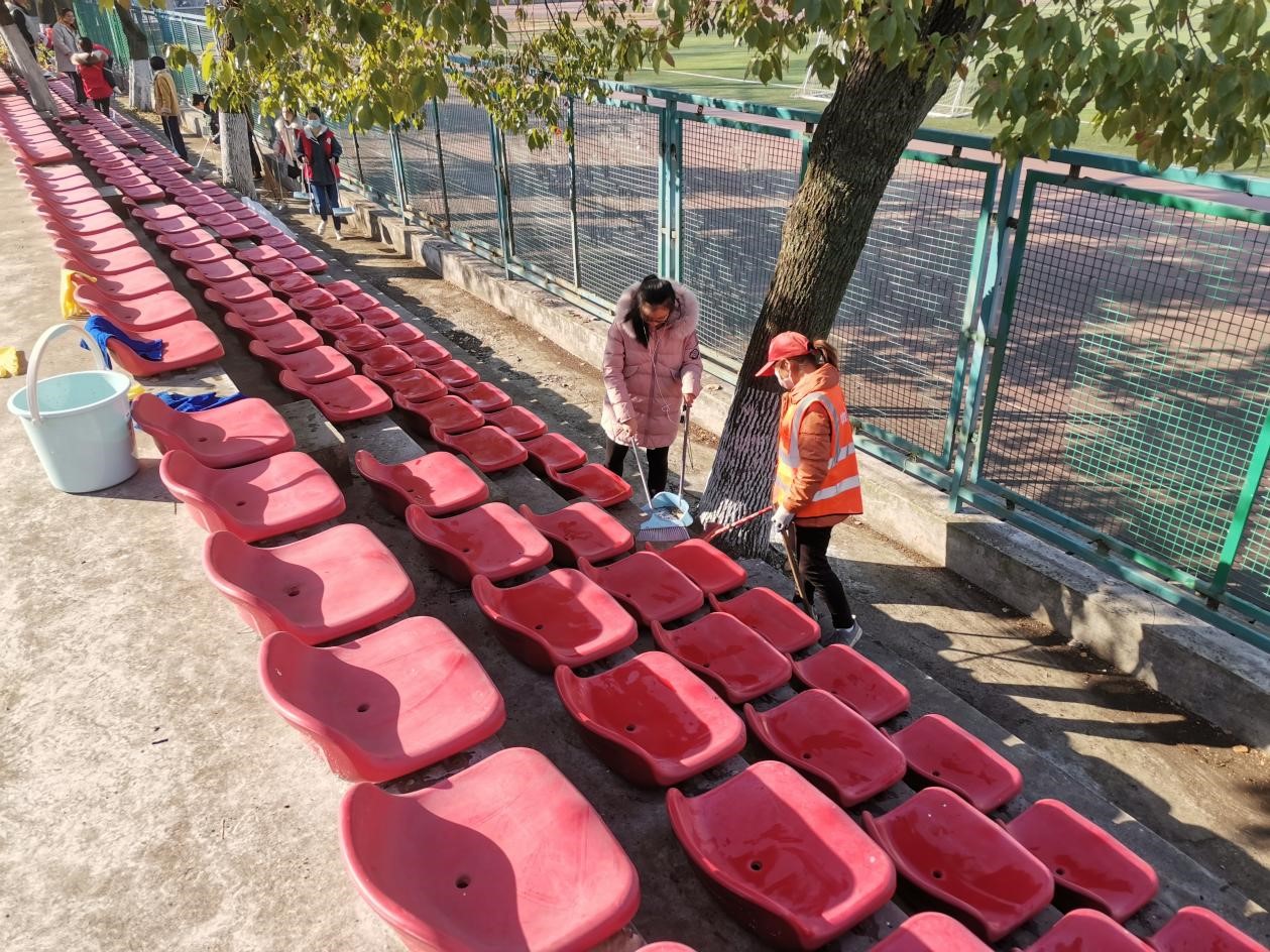 经过近两个小时的清理,落叶不在,椅子一尘不染,整个观众席在阳光的照耀下洁净如新。