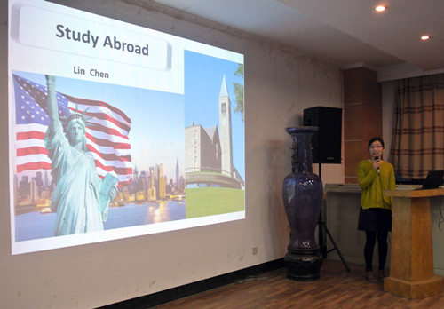 接下来,留学于美国康奈尔大学的陈琳博士介绍了自己的课题,并对康奈尔大学做了简单介绍,紧接着介绍了自己在美国的学术活动及其他活动情况。陈琳博士着重将自己在美国的衣食住行作了具体介绍,并提醒同学们注意美国的生活礼仪。随后,陈琳博士作为代表接受了同学们的现场提问。就同学们最关心的出国英语要求、如何联系导师、如何通过导师考核等问题做出了详细回答。陈琳博士着重指出,在与导师交流的过程中,不能表现得过于卑微,要将自己的自信展现出来,要让老师觉得你有能力进入他的研究团队。